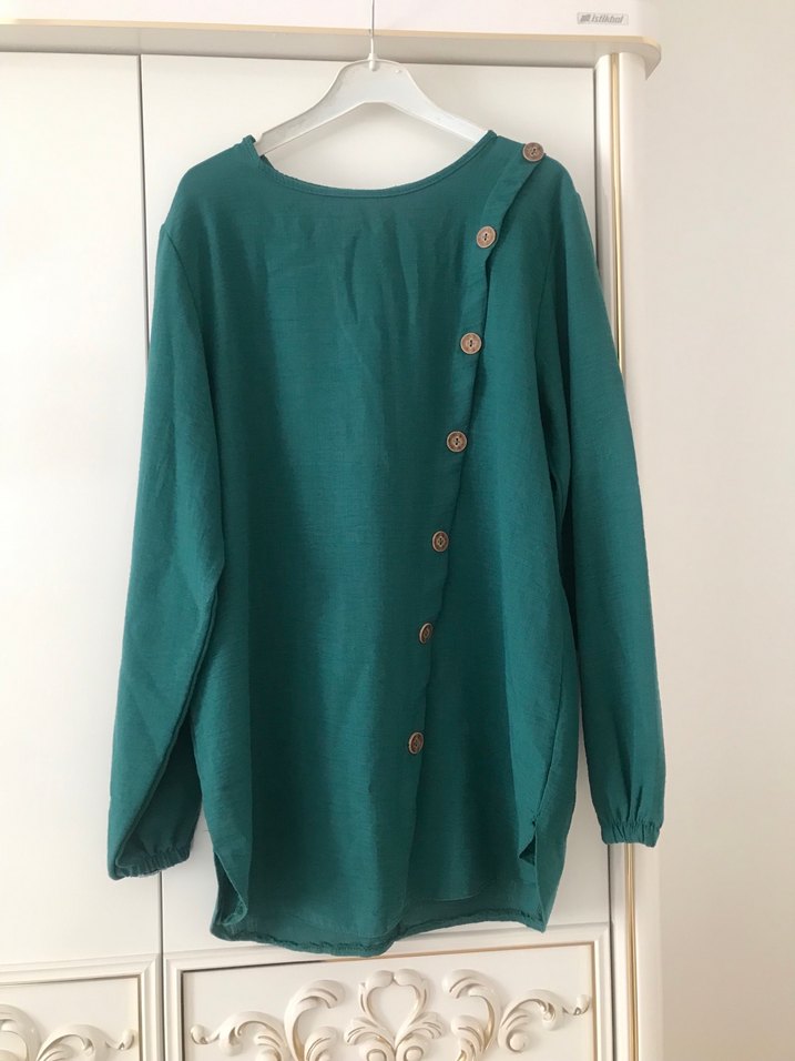 Düğmeli, uzun kollu ve yuvarlak yaka, bol kesim yeşil bluzu. Yumuşak keten kumaştan, normal midi boyda, günlük kullanım için uygundur.ıkı koltuk arası 51 boy 74
