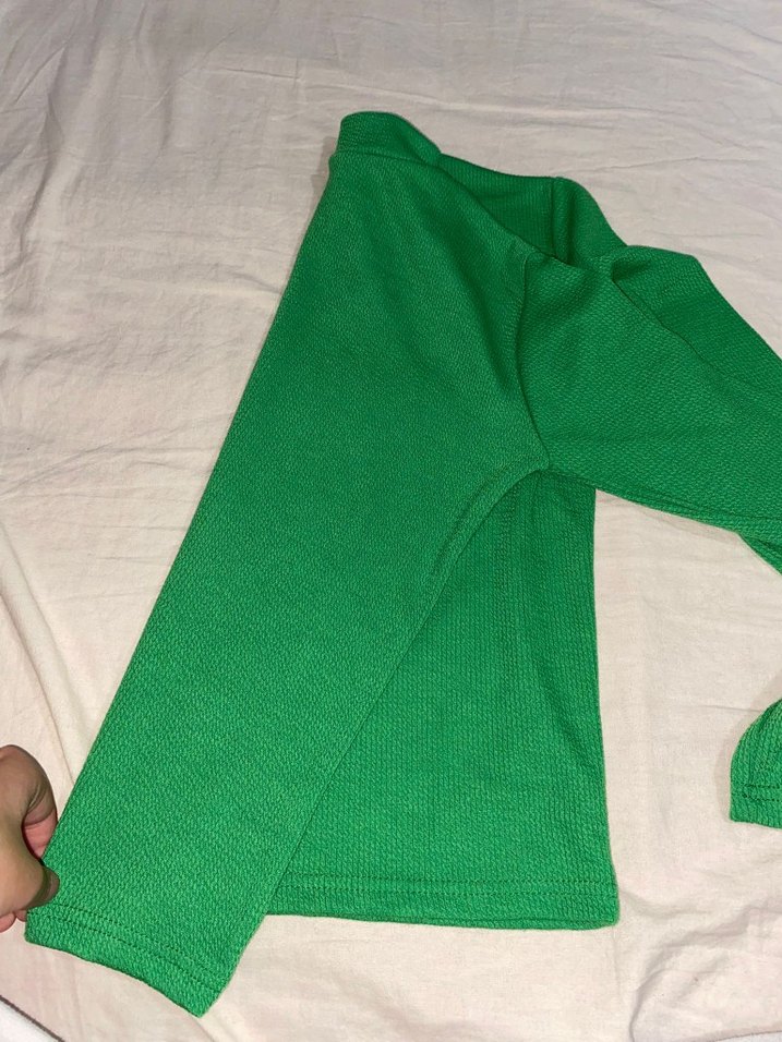 Düğmeli, yeşil, boğazlı ve uzun kollu kadın kazak. İnce kesimi ve parlak dokusuyla günlük sokak stiline uygun.Xl fakat küçük bedenlere uygundur