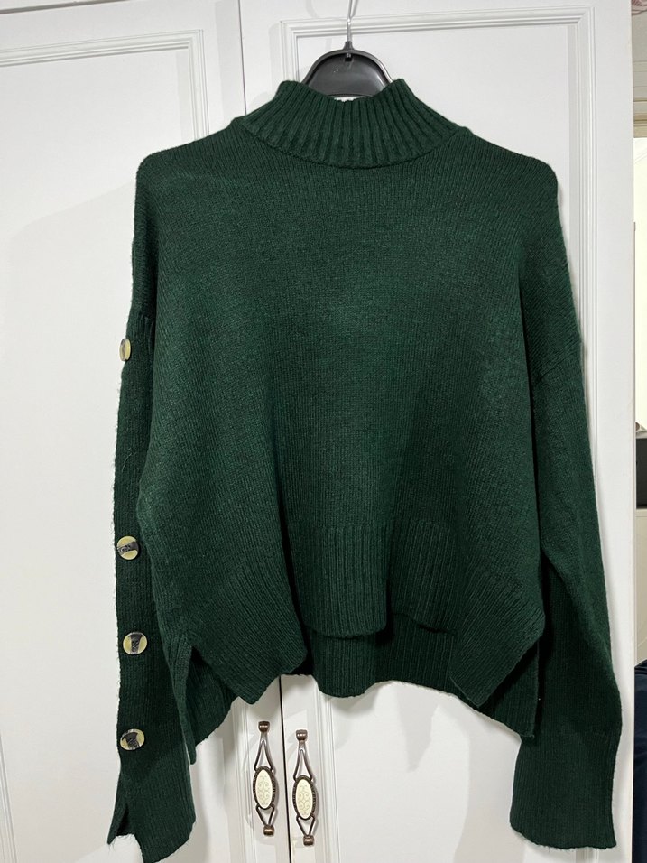 Düğmeli ve boğazlı uzun kollu bu koyu yeşil triko kazak, rahat ve midi boyda, günlük sokak stiline uygun. Hiçbir kusuru yoktur ✨ Yeni gibidir M Beden L ye de olur