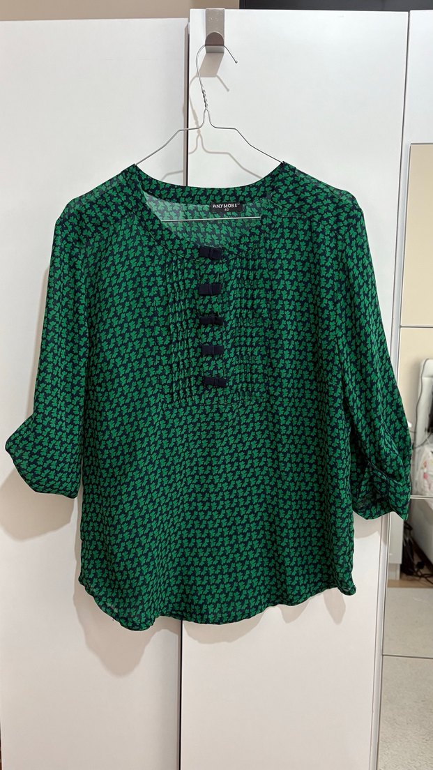 Düğmeli, uzun kollu, yuvarlak yaka, bol kesim yeşil bohem bluz. Midi boyda, yumuşak sentetik kumaştan, günlük kullanıma uygun.