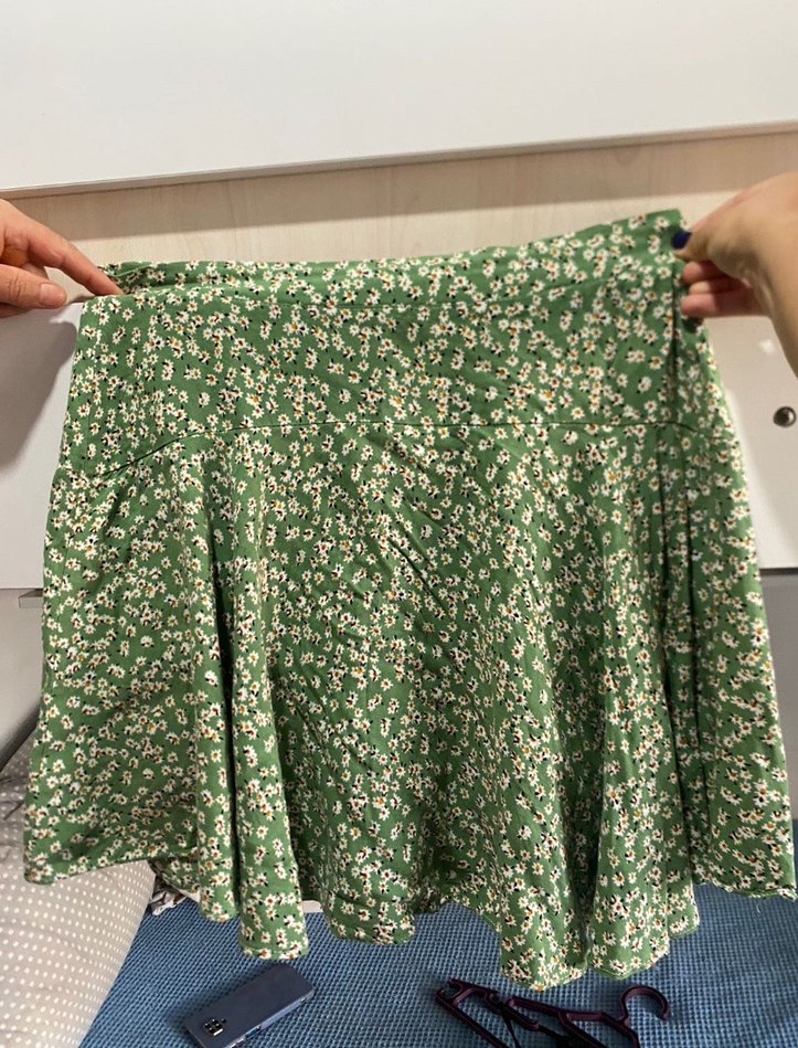 Hafif yeşil tonunda,bol kesim mini etek, yumuşak sentetik kumaştan ve ince çiçek desenli.