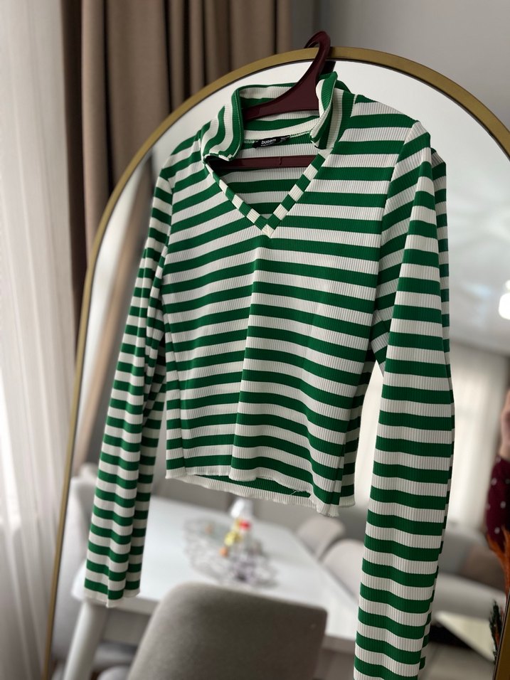 Düğmeli, uzun kollu, balıkçı yaka ve yeşil-beyaz çizgili, vücuda oturan kadın kazak. Yumuşak sentetik kumaştan, parlak görünümlü, günlük rahat stil için uygun.