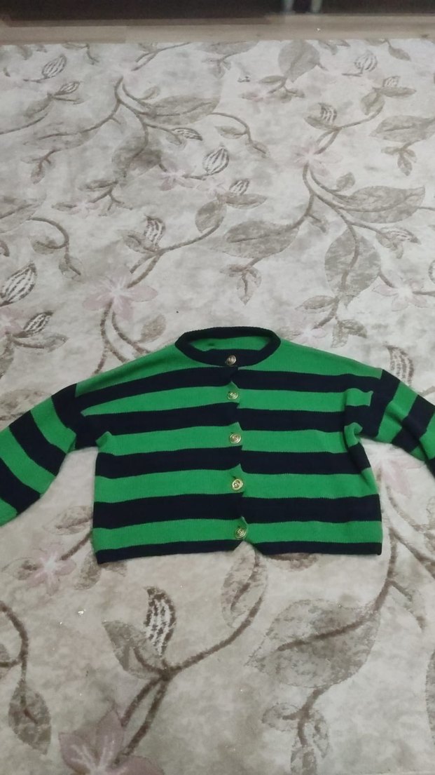 Uzun kollu, düğmeli ve boğazlı yaka kadın hırka. Triko kumaştan, rahat kesimli ve koyu yeşil-siyah çizgili, gündelik sokak stili için uygun.