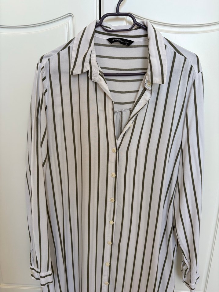 Düğmeli, uzun kollu, yakalı kadın keten gömlek. Gri çizgili ve bol kesim, günlük ve iş stiline uygun. Pamuklu urun defosu tirtigi lekesi yoktur