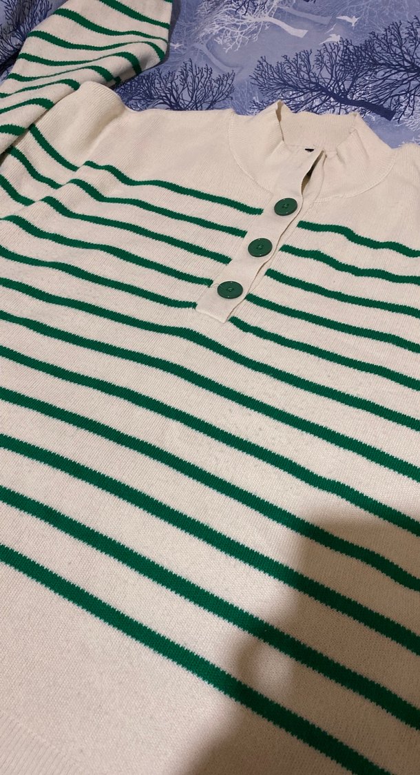 Düğmeli ve yeşil çizgili, pamuklu, uzun kollu, salaş kesim kadın kazak. Tekne yaka ve günlük rahat stil için uygundur. Milla ürünü etiketi kesmiştim ama 4xl falan ölçüleri yazıyorum Göğüs:74 Boy:72 Hafif tiftikli o yüzden uygun