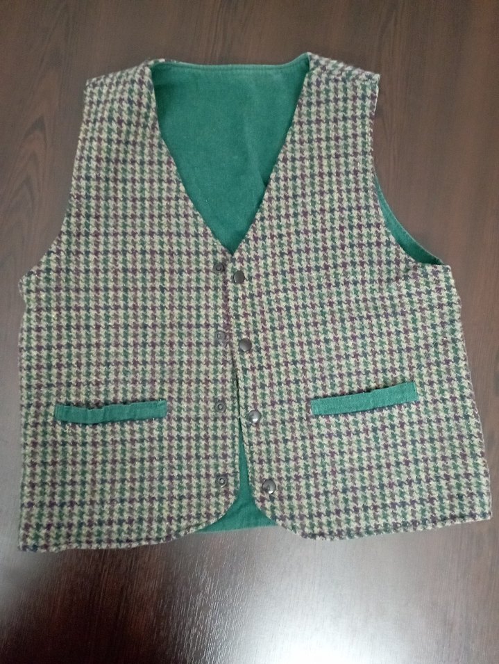 Düğmeli, yeşil tonlarında erkek yelek. Normal kesim, notched lapel yakalı ve iki cepli. Vintage tarzda, günlük kullanıma uygun.