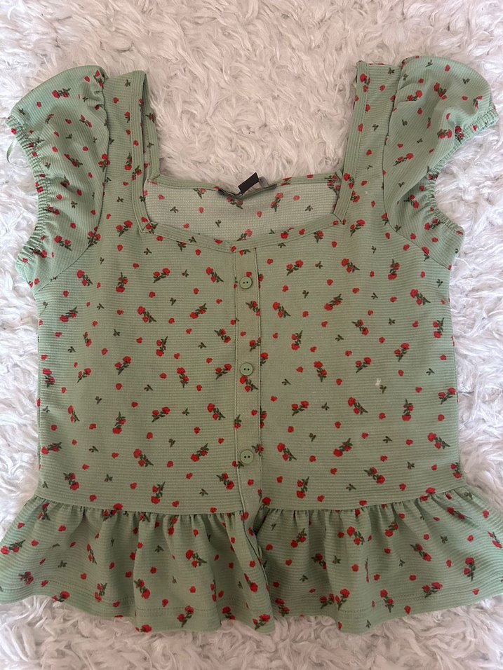 Düğmeli ön kısmı ve kısa kollu, salaş kesim yeşil bluz. Çiçek desenli, kayık yaka ile bohem tarzı yansıtır.