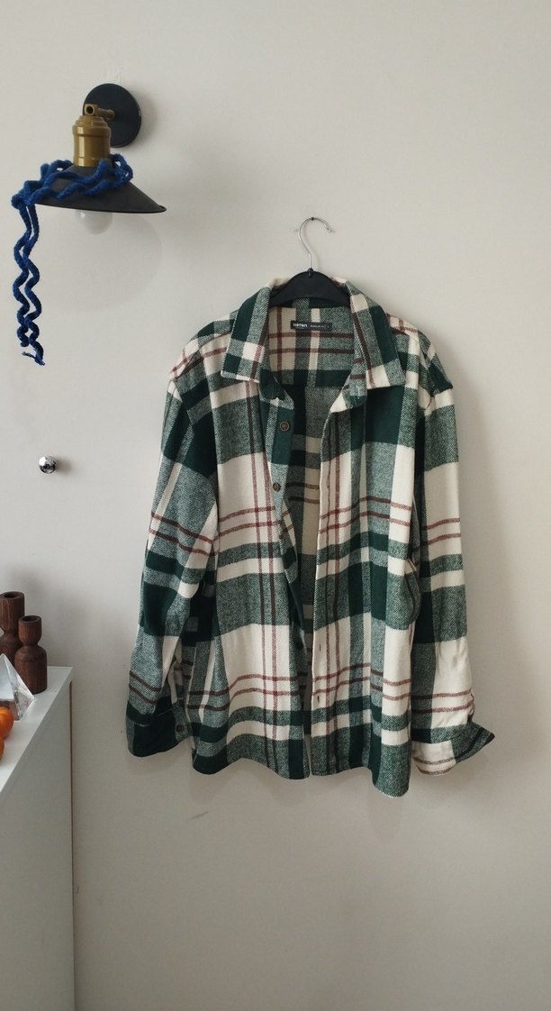 Düğmeli, uzun kollu yeşil ekose erkek gömlek, rahat kesim yumuşak ve rahat kumaştan üretilmiştir. boyu 76 santimetre koltuk altından iki kol arası 59- 60 santimetre
