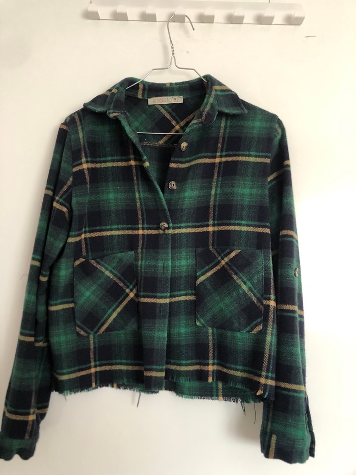 Yumuşak yünden yapılmış, düğmeli, cep detaylı, uzun kollu, yeşil ekose kadın gömleği. Salaş kesimi ve notched lapel yakasıyla rahat bir görünüm sunar.