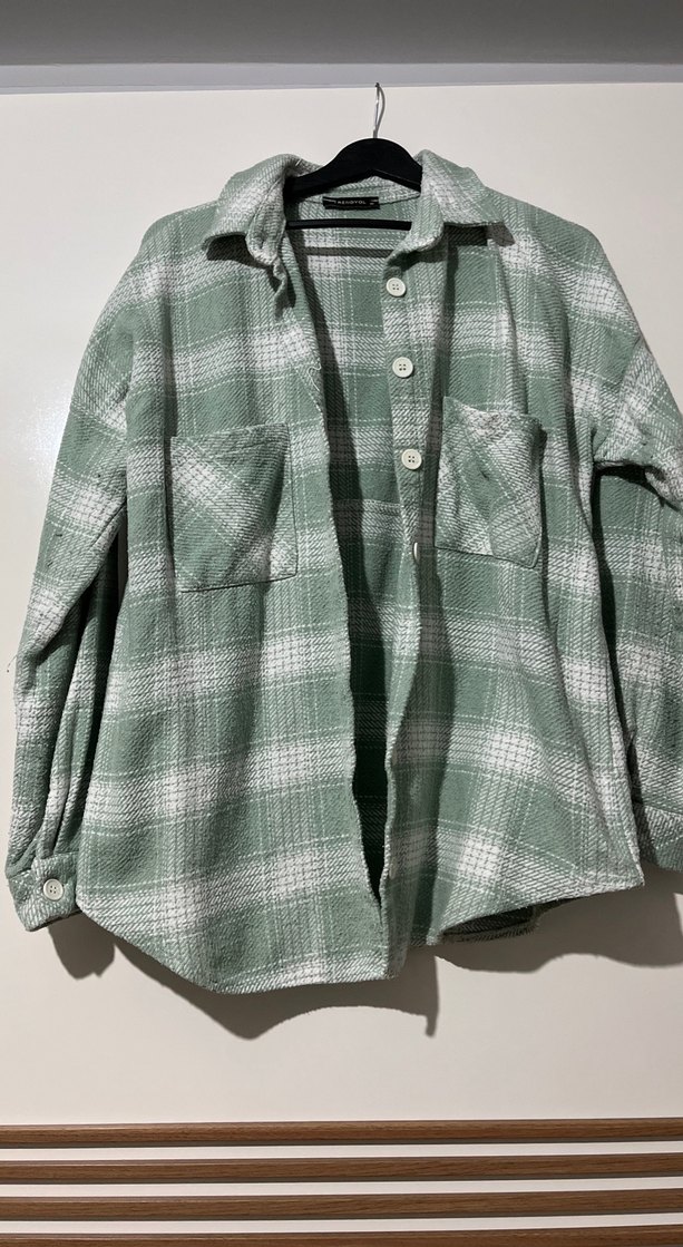 Düğmeli, uzun kollu, yeşil ve gri ekose desenli kadın gömleği. Notlu yaka ve iki cep içerir. Rahat ve bol kesim, günlük rahat kullanım için uygundur.