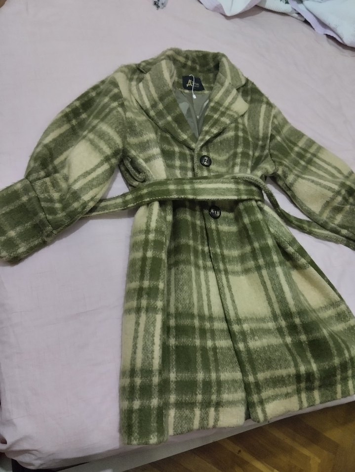 Yumuşak ve sıcak kumaştan yapılmış, uzun kollu, düğmeli ve kemerli, yeşil-gri ekose desenli kadın kabanı. Rahat ve bol kesimdir.