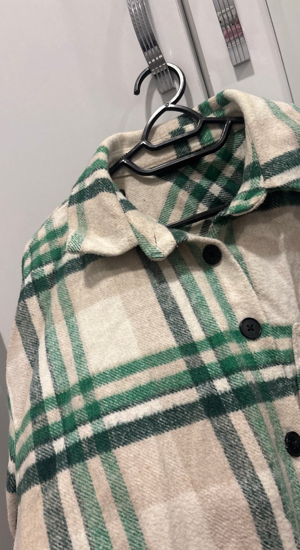Yeşil ve gri ekose desenli, düğmeli, yumuşak ve sıcak kumaştan yapılmış, uzun kollu, notched lapel yakalı ve bol kesimli kadın gömleği. Günlük kullanıma uygun midi boyda.