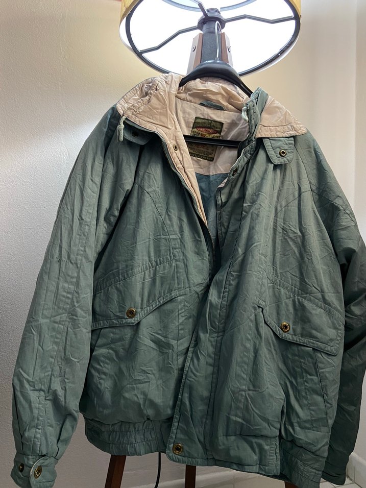 Düğmeli önü, kesimli yaka ve uzun kollu yeşil erkek ceket. Bol kesim, normal uzunluk ve keten kumaştan vintage tarzda günlük kullanıma uygun.