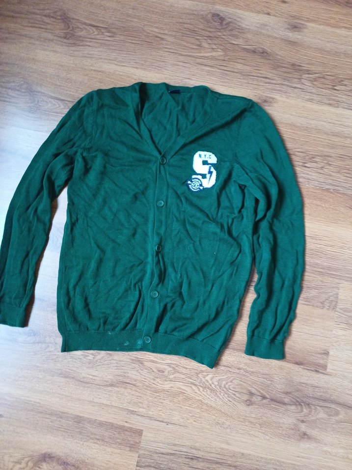 Uzun kollu, düğmeli yeşil erkek çocuk hırkası, rahat kesim ve yumuşak, sıcak kumaştan üretilmiştir. Göğüste küçük bir logo detayı vardır.