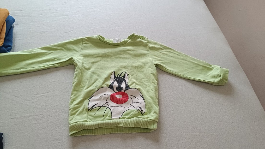 Düğmeli, uzun kollu, yeşil erkek çocuk sweatshirtü, yumuşak fleece kumaştan ve renkli baskılıdır. Rahat kesimlidir ve omuzda düğme detayı vardır.