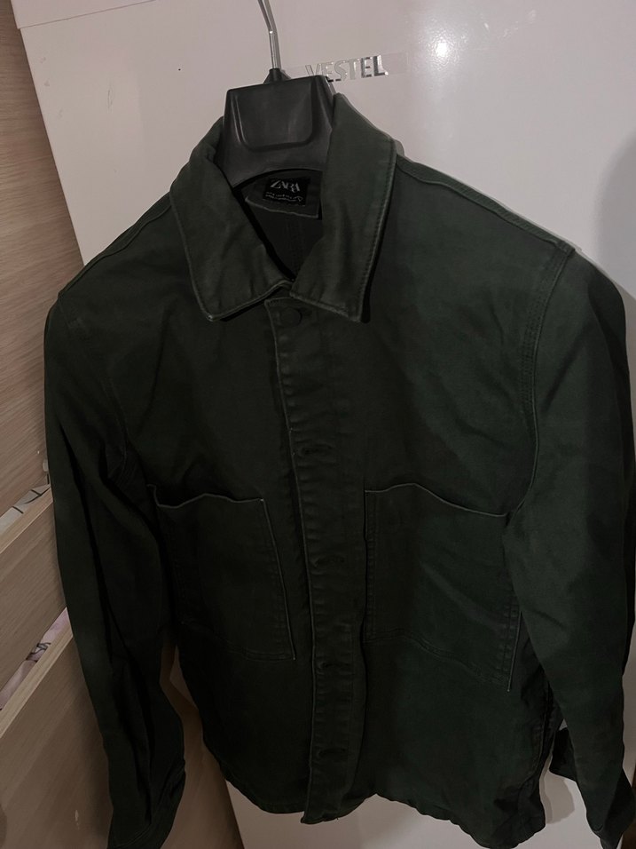 Düğmeli önü, kırçıllı yeşil keten kumaştan yapılmış, notalı yaka ve uzun kollu erkek ceketi. Normal uzunlukta, rahat kesim ve günlük sokak stili için uygundur.