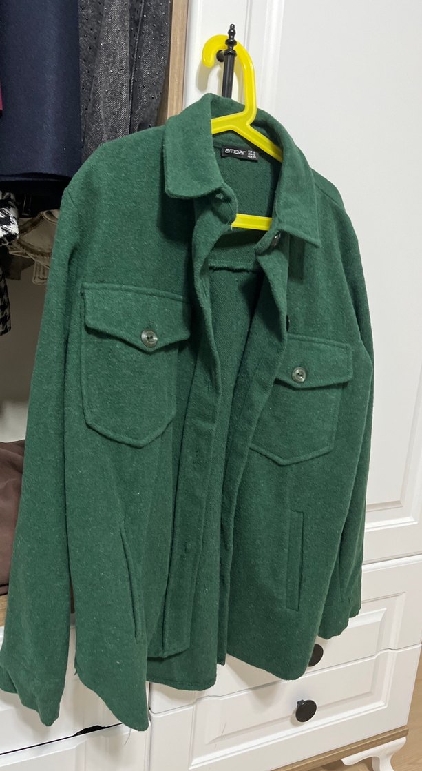Düğmeli ön, sivri yaka ve uzun kollu koyu yeşil erkek kaban. Yumuşak ve sıcak kumaştan, rahat kesimli ve günlük kullanıma uygun sokak stili.