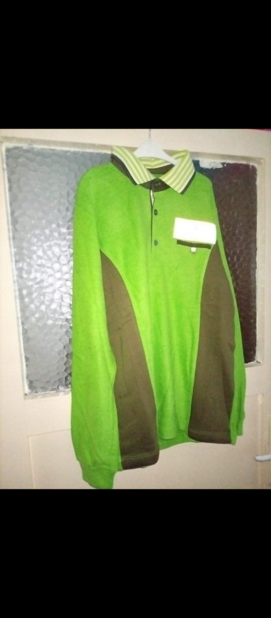Uzun kollu, düğmeli yakalı erkek polar sweatshirt. Yeşil ve gri renk bloklarıyla rahat kesim, günlük sokak tarzına uygun.