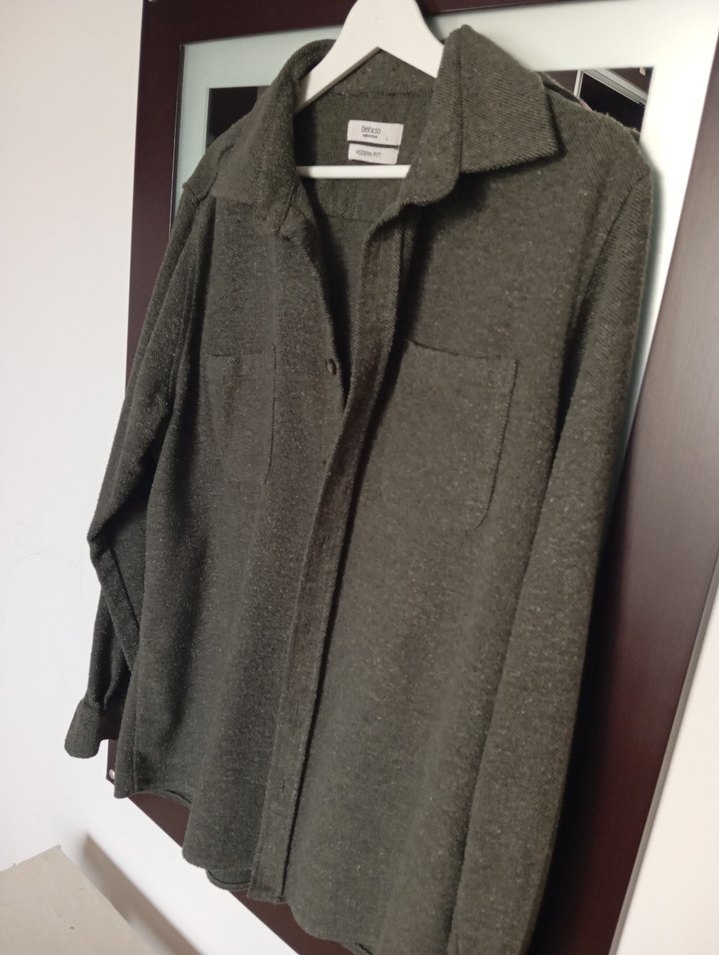 yeşil yün gömlek, düğmeli önü, uzun kollu ve standart kesimlidir. hakim yaka detayıyla günlük kullanıma uygundur.