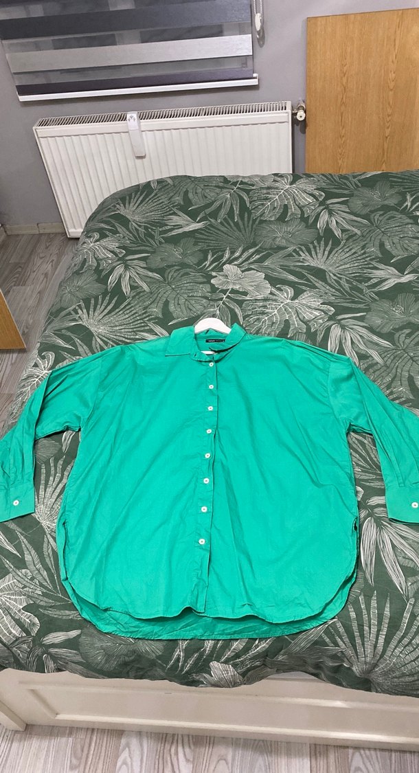 Düğmeli, uzun kollu, yakalı yeşil gömlek. Bol kesim ve normal boy uzunluğunda, günlük rahat giyim için uygundur. Sadece yıkandı ama giyinilmedi Göğüs ölçüsü 64-65 cm