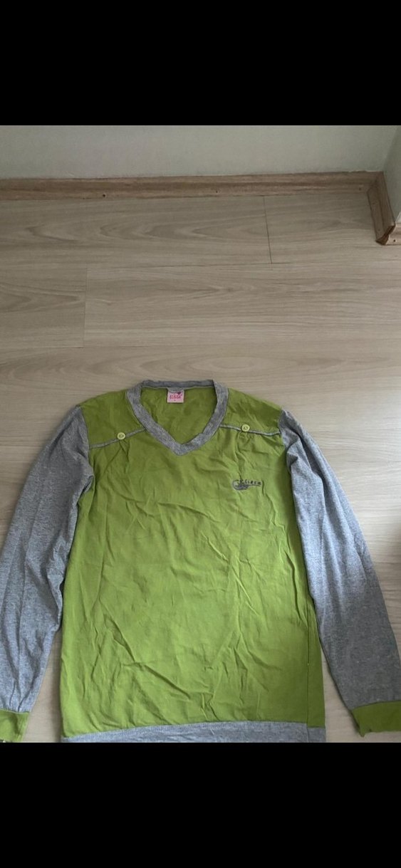 sweatshirt, uzun gri kollara, yeşil gövdeye ve yakada düğme detaylarına sahiptir. Pamuklu, bol kesim ve yuvarlak yakalıdır, günlük rahat kullanım için uygundur. Kolun alt kısmında küçük bir delik var görsel ekli
