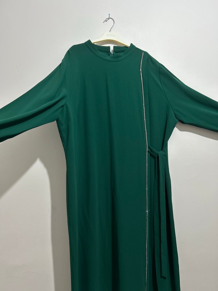 Uzun kollu , yuvarlak yakalı bu yeşil elbise sentetik kumaştan yapılmıştır. Uzun boyu ve taşlı deseniyle abiye stiline uygundur.