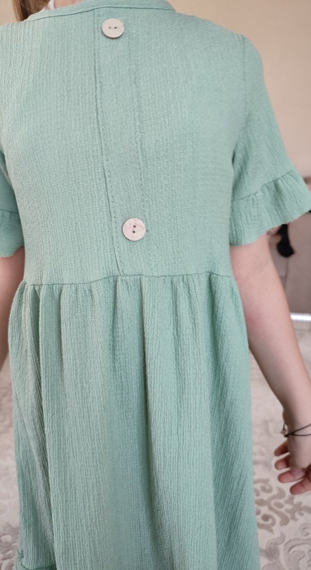 Yeşil hamile midi elbise, bol kesim ve kısa kolludur. Yumuşak keten kumaştan, yuvarlak yaka ve düğme detaylıdır. Bohem tarzda rahat bir seçimdir.