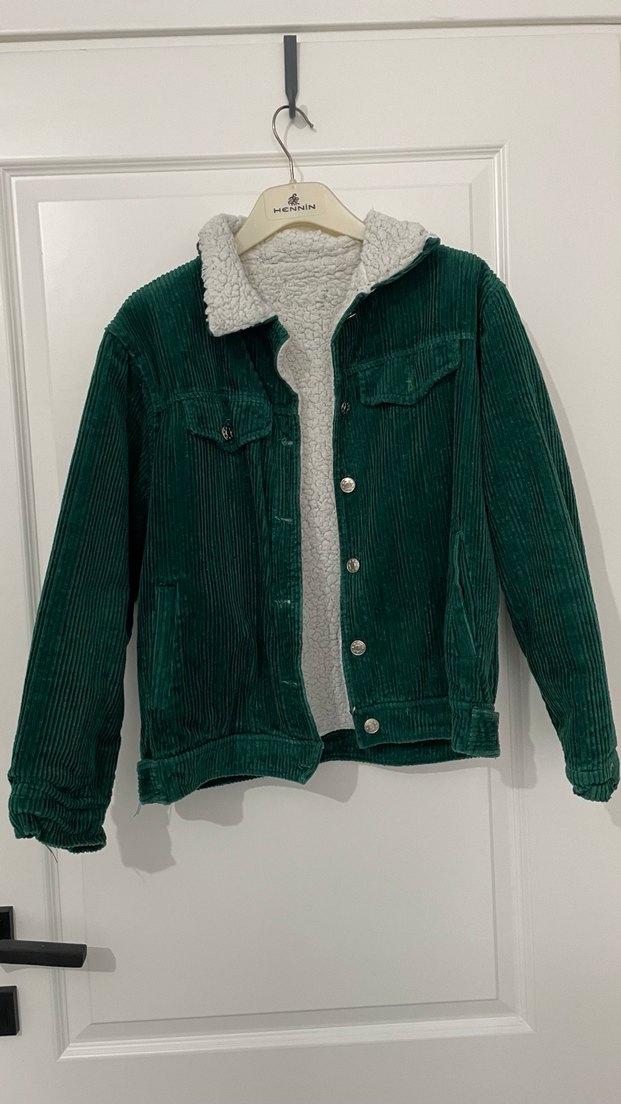 Düğmeli yeşil kadife ceket, içi yumuşak kumaşla kaplı, uzun kollu ve bol kesimli, günlük rahat kullanım için uygundur.M/L bedendir