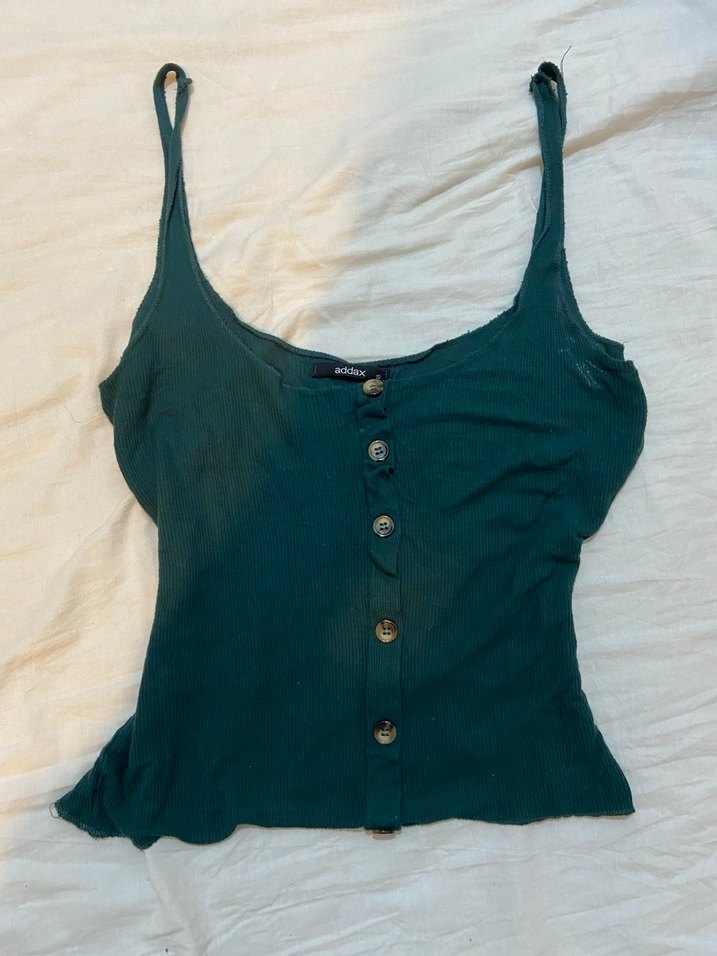 Düğmeli ve askısız yaka tasarımlı, yeşil renkli, keten kumaştan yapılmış, sokak stiline uygun, vücuda oturan kadın atlet. Kolsuz ve midi boyda, günlük kullanım için ideal. Üzerinde macun lekesi var yıkanıp gönderilecek