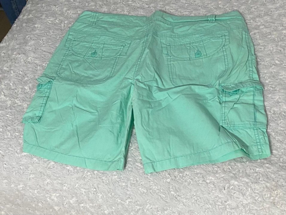 kargo sortu Pamuklu, düğmeli cepli, pastel yeşil renkli, bol kesim kadın bermuda şort, günlük açık hava kullanımı için uygundur.