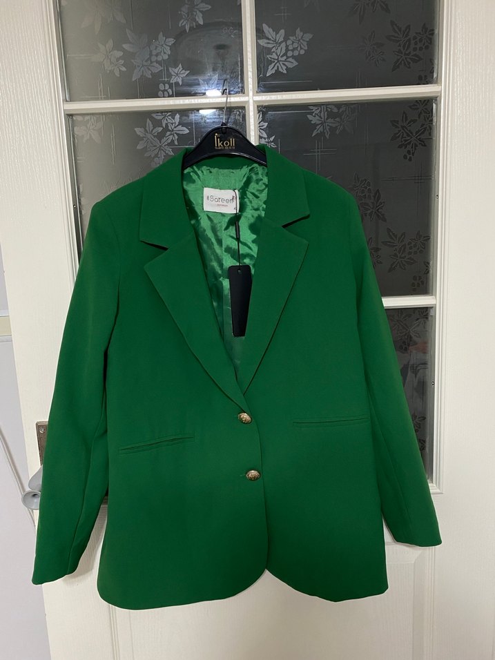 Düğmeli, yeşil kadın blazer ceket, kesik yaka ve uzun kolludur. Normal kesim ve midi boyda, ofis için uygundur. Yumuşak ve sıcak kumaştan üretilmiştir.