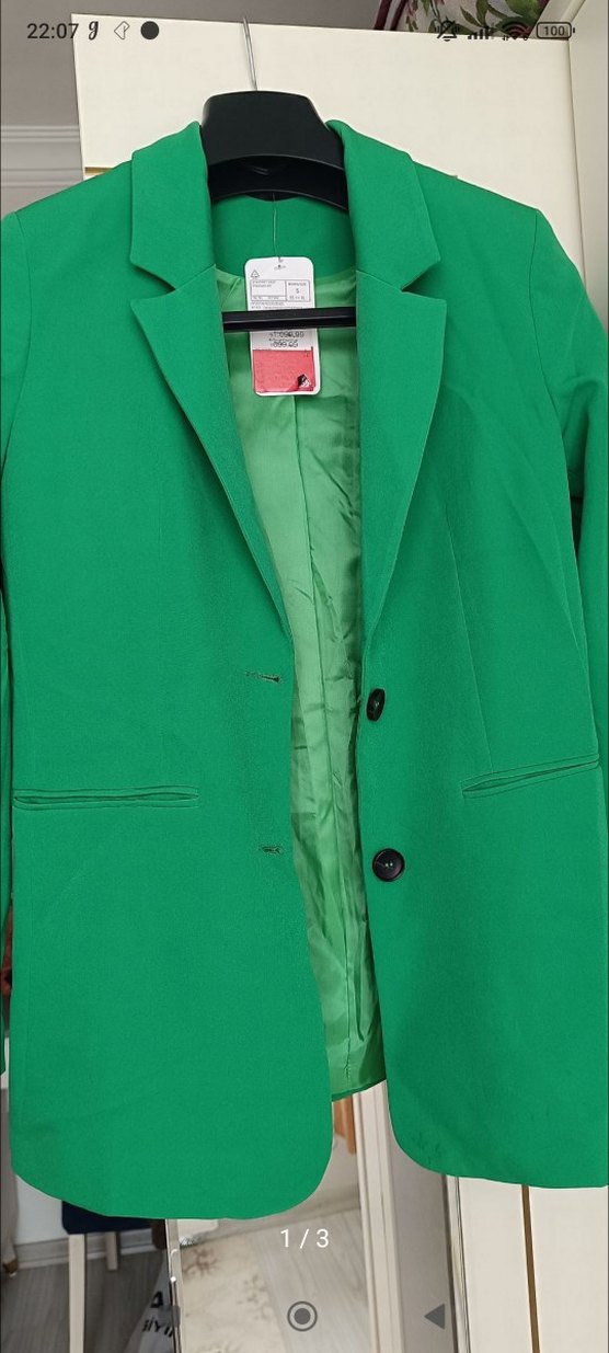 Yeşil renkli, düğmeli ve kesik yaka detaylı kadın blazer ceket. Normal boy, uzun kollu ve regular fit yapıda, sentetik kumaştan üretilmiştir. Ofis ve günlük tarz için uygundur.