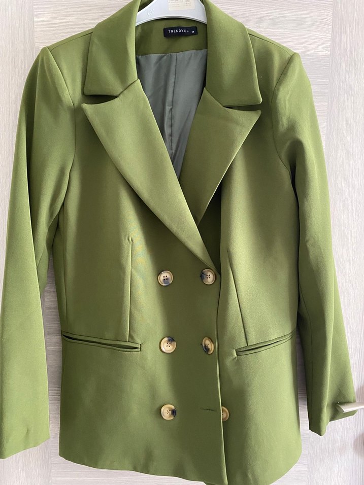 Düğmeli, yeşil renkli kadın blazer ceket, normal kesim ve uzun kolludur. Parlak dokusu ve kesimiyle ofis kullanımı için uygundur.