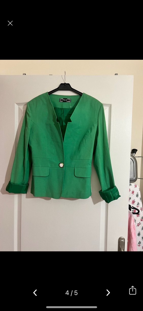 yeşil renkli, düğmeli ve kesimli yakalı kadın blazer ceket. Uzun kollu, kısa boy, modern klasik tarzda ofis kullanımı için uygun. Yaklaşık ölçüler Omuzdan boy 58cm İki kol arası 45cm Ürün sıfırdan farksızdır kusursuzdur Cepleri görüntüde var aslında yok Etiketinde 42 yazıyor ama 40 bedene daha uygun Markasızdır