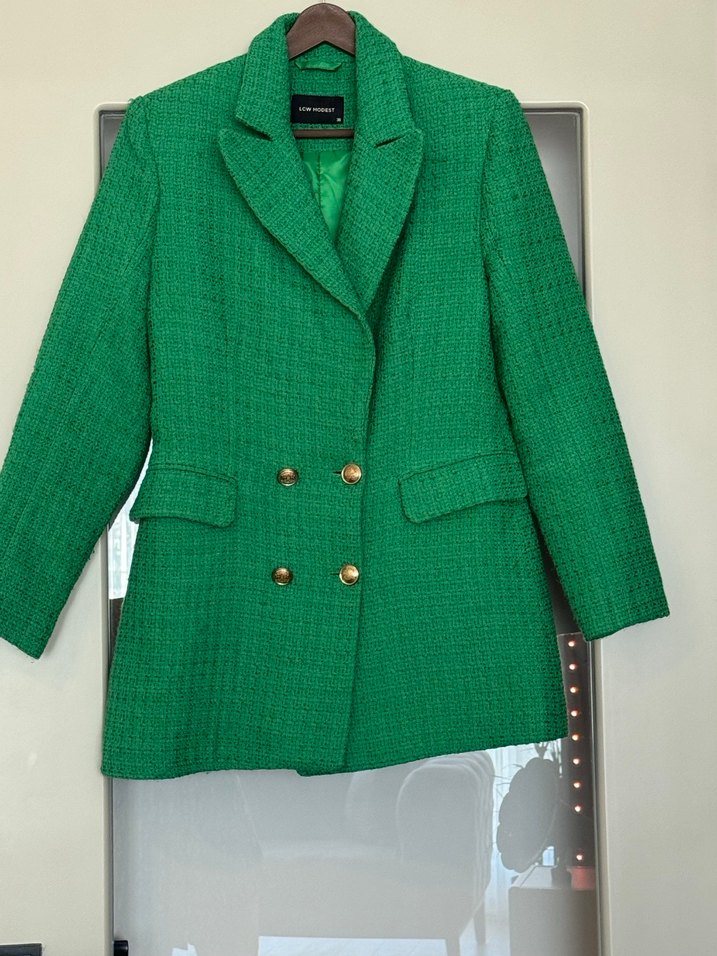 Yeşil renkli, düğmeli ve normal boyda kadın blazer ceket. Notlu yaka ve uzun kollu, parlak görünümlü, iş ve günlük kullanıma uygun.