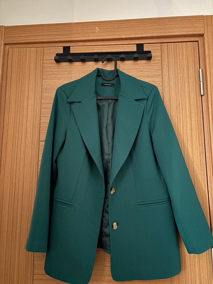 Düğmeli, yeşil kadın blazer ceket, kesik yaka ve uzun kolludur. Midi boyda, normal kesim ve desen içermeyen sentetik kumaştan üretilmiştir. Ofis için uygundur. Hiç giyilmedi.