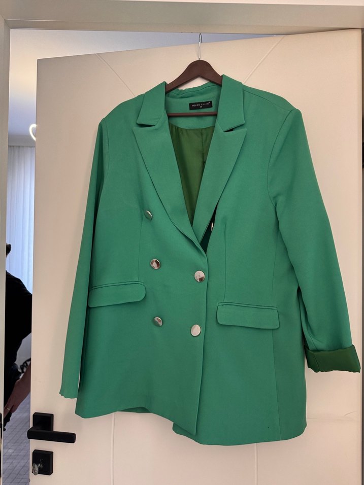 Düğmeli önü, kesik yakası ve uzun kollu yeşil kadın blazer ceket. Parlak sentetik kumaştan, normal boyda ve rahat kesimdedir. Ofis ve günlük şıklık için uygundur.