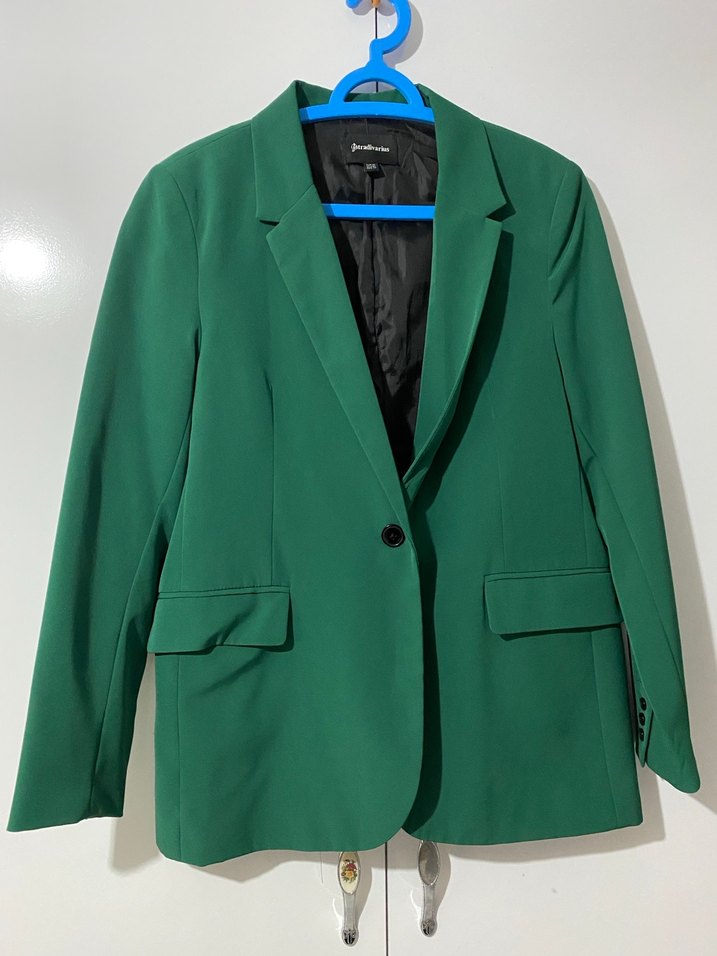 Düğmeli, yeşil renkli kadın blazer ceket, normal boy ve midi kesim. Uzun kollu, düğmeli ve klasik yakalı, iş ve günlük kullanıma uygun.