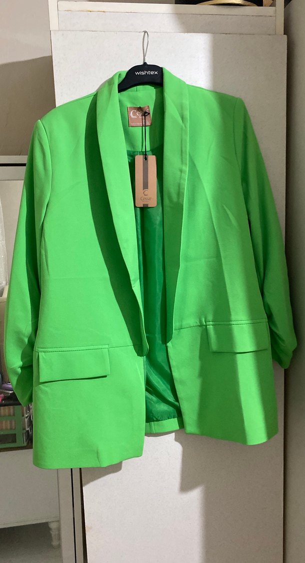 Düğmeli ve parlak yeşil renkte, normal boyda kadın blazer ceket. Uzun kollu, kesimi rahat ve ofis kullanımı için uygundur.