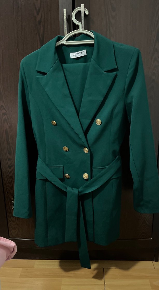 Düğmeli, yeşil tonlarında kadın blazer ceket, klasik yakalı ve kemerli tasarıma sahiptir. Ofis ve günlük kullanıma uygundur.