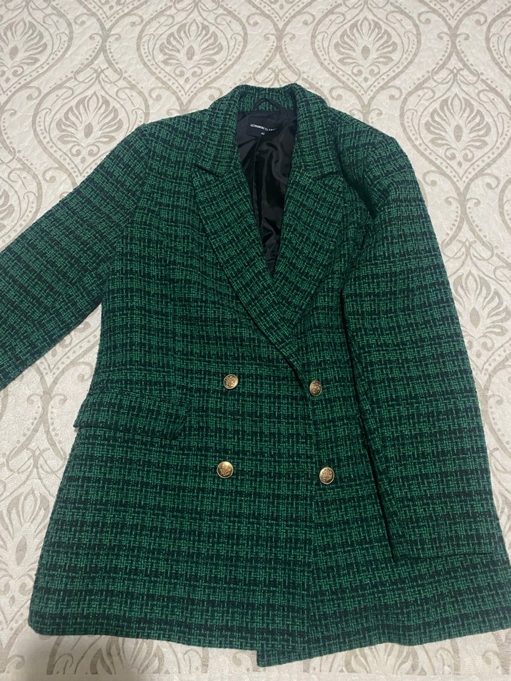 Düğmeli, yeşil kadın blazer ceketin yakası kesimlidir ve uzun kolludur. Yün kumaştan, normal uzunlukta ve rahat kesimlidir, ofis için uygundur.