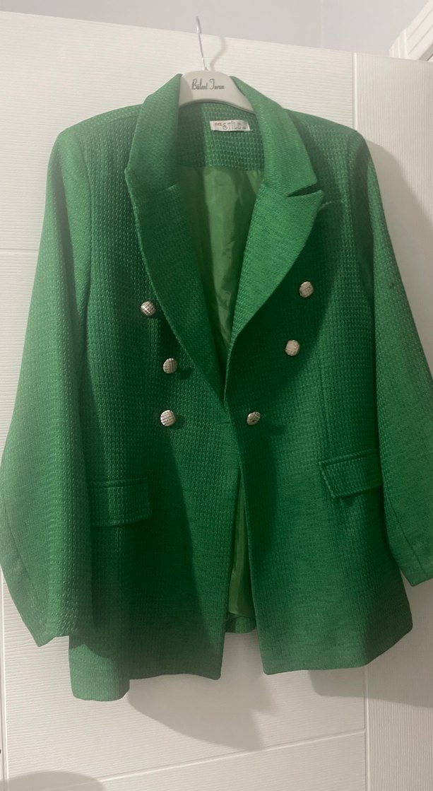 Uzun kesim, düğmeli yeşil kadın blazer ceket, yakalı ve düz desensizdir. Ofis kullanımı için uygun, parlak sentetik kumaştan yapılmıştır. ✨