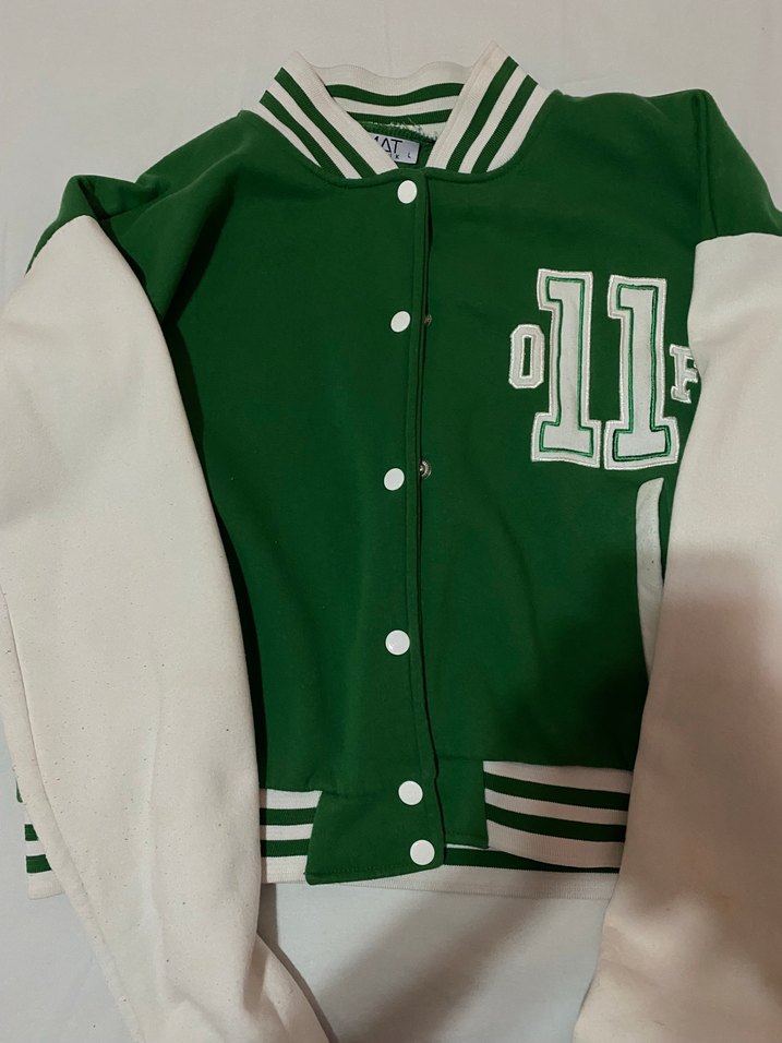 Düğmeli, uzun kollu, bisiklet yaka, baskılı ve yeşil renkli hafif dokulu kadın bomber cekettir. Spor ve şık görünüm sunar.