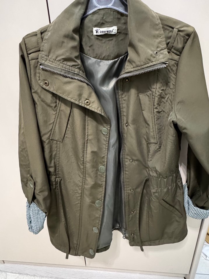 Yeşil renkli, düğmeli ve geniş yakalı kadın ceket. Sentetik kumaştan, uzun kollu ve bol kesim, günlük rahat stil için uygundur.