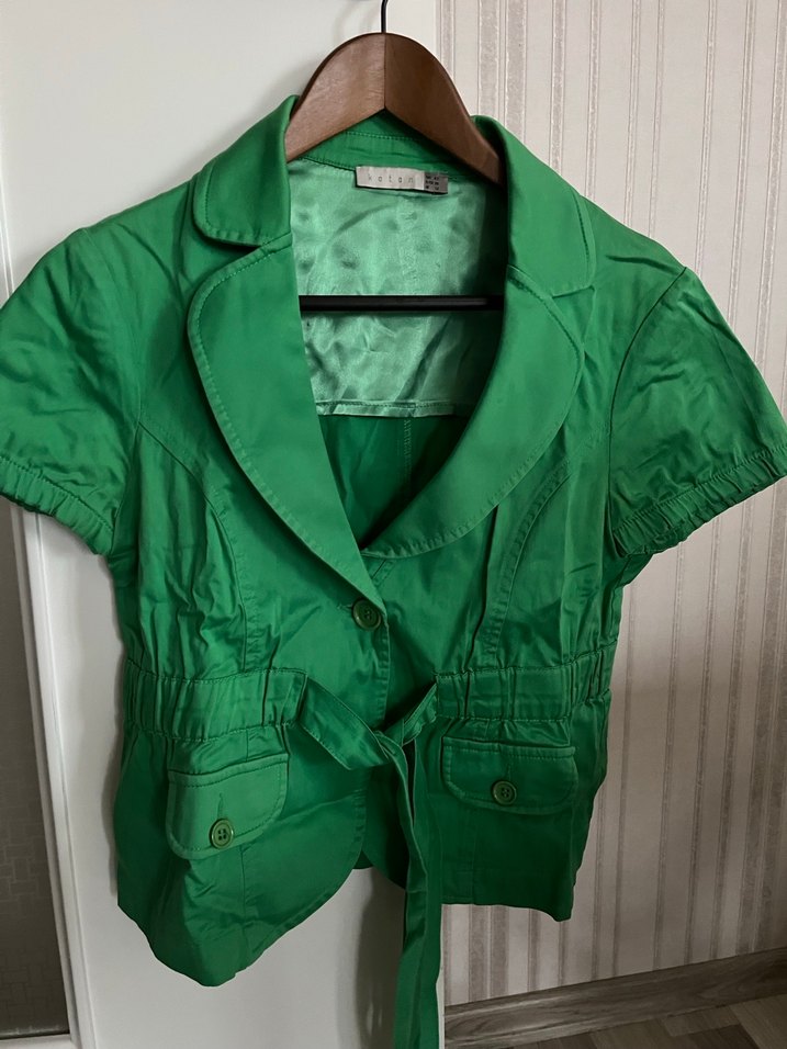 Düğmeli, kısa kollu, yeşil kumaştan, parlak görünümlü, kısa boy midi ceket. Ofis ve günlük sokak stili için uygundur.