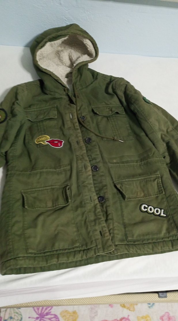 Düğmeli yeşil kadın ceket, uzun kollu ve rahat kesimdir. Yumuşak, sıcak kumaş deseniyle dış mekan kullanımı için uygundur. Ceket üzerinde 'COOL' yazısı ve yamalar bulunur.