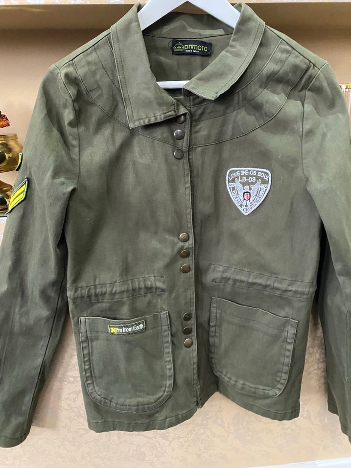 Düğmeli, uzun kollu, yeşil ceket. Kamuflaj desenli ve yamalarla süslenmiş, günlük rahat kullanım için uygun.