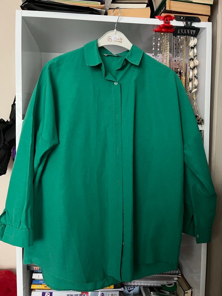 Düğmeli ön cepheli, uzun kollu, yakalı ve bol kesim yeşil keten gömlek, günlük rahat kullanım için uygundur.