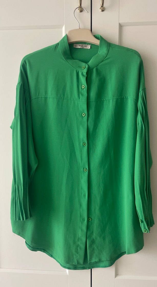 Parlak yeşil renkte, düğmeli ve uzun kollu, bol kesim kadın gömleği. İpeksi dokusuyla rahat ve şık bir seçimdir. Az kullanılmıştır sorun yoktur iki koltuk arası ölçüsü 56 santim