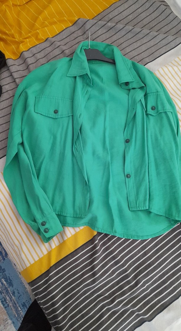 Yumuşak kumaştan, düğmeli, yeşil renkli, uzun kollu, notched lapel yakalı bol kesim kadın gömleği. Günlük sokak stiline uygun. Özel dikim bir gömlektir. Bedeni büyük geldiği için satıyorum.